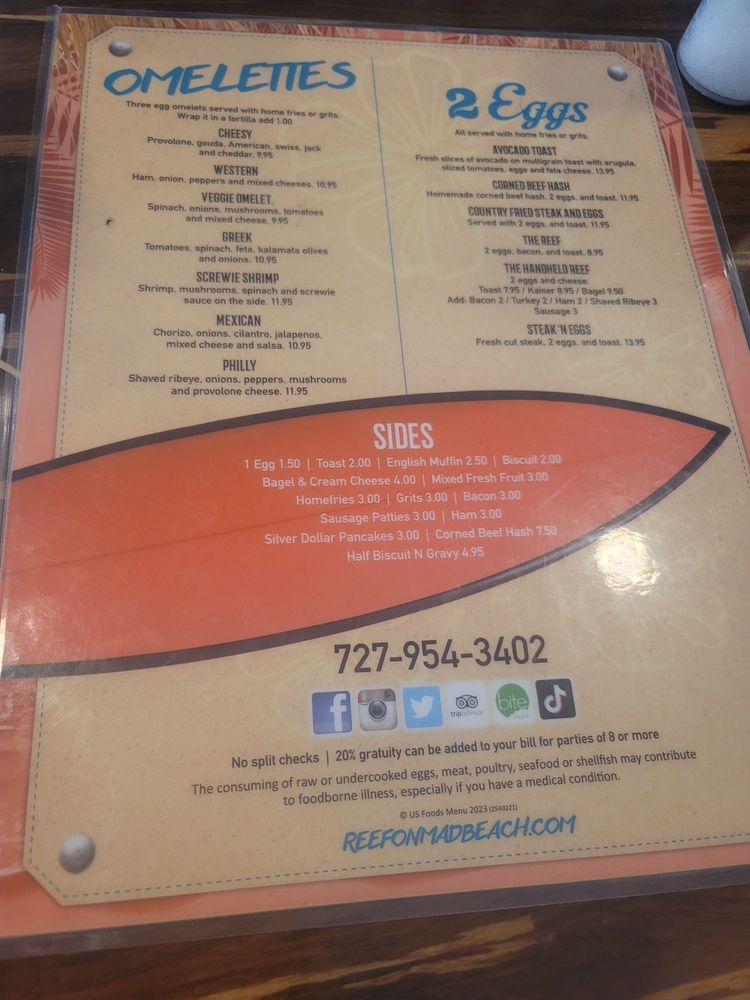 Breakfast options like the Screwie Shrimp Omelet promise a delicious start to your day. Complement your meal with crispy French fries or a fresh fruit cup. Customers rave about the lively atmosphere, excellent service, and tasty dishes that keep them returning. So, whether you're dancing with friends or enjoying a meal on the outdoor patio, The Reef Bar and Grill is the place to be!